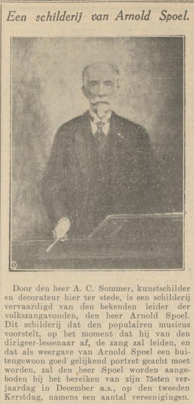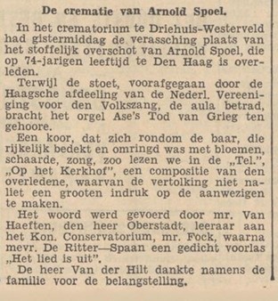 Koerantberig oor sy afsterwe: “Crematie Arnold Spoel – Een laaste groet van de Hagenaars. ‘s Gravenhage, 14 December 1934. Heden, den dag der crematie van het stoffelijk overschot van den beminden volkszangleider, Arnold Spoel, is aan de Haagsche ingezetenen de gelegenheid gegeven een laatste afscheid te nemen. De kist stond opgesteld in de voorhall van het gebouw van Kunsten en Wetenschappen, waar Spoel zoo velejaren gewerkt heft ten bate van den volkszang. De hall was ingericht als chapelle ardente. Gedurende het defile werd treurmuziek gespeeld “Van een Koningsvrouwe”, door Spoel gecomponeerd. Het defile, waaraan door velen werk deelgenomen, duurde een uur.”