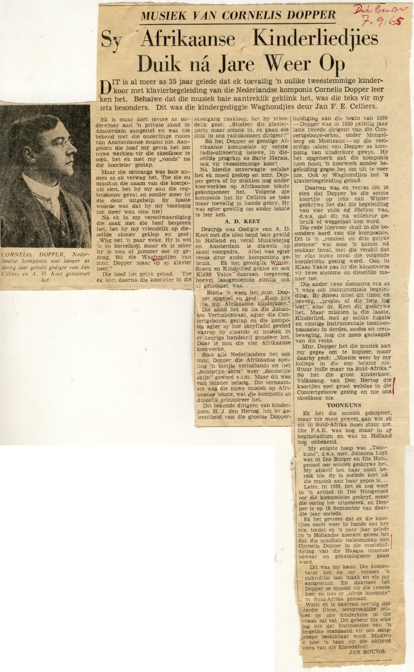 In 1930 loop Cornelis Dopper vir Jan Bouws (1902 – 1978) raak en raak so bewus van Keet se gedigte. Binne ‘n week nooi Dopper vir Bouws uit om na sy vier Afrikaanse liedere te gaan luister. Die eerste wat Bouws opgeval het, is Dopper se foutiewe spelling van Afrikaans: “Soos alle Nederlanders het ook Dopper die Afrikaanse spelling ‘n bietjie ver-Hollands en het “Sonnetjie Skyn”, “Sonnetjie skijn” geword.” Die eerste toonsettings was net met eenvoudige klavier begeleiding, maar is toe verander met Winter na begeleding met vier viole ad libitum. Dopper wou die lied as ‘n rondeel vir drie stemme komponeer. In die gedig Klaas Vakie gaan hy anders te werk – met twee stemme. Met die ander twee gedigte, Sneeu en Kinderlied, kon hy die instrumentale begeleiding nie weglaat nie. Dopper: “Bij Sneeu moet de muziek tintelen en bewegen, precies alsof de lucht leeft. Dat is wat Keet heeft bedoeld.” Keet se gedigte wat deur Dopper getoonset is, is uitgegee onder die naam Zuid-Afrikaanse Liederen: voor vrouwen- of kinderkoor en piano. Detail rakende die toonsettings van die ander gedigte is as volg: Die gedig Winter: rondeel vir drie gelyke stemme met begeleiding van vier viole ad libitum; Klaas Vakie: kanon vir twee stemme, met ‘n begeleiding van vier viole; Sneeu: vier stemme, met ‘n begeleiding van vier viole; Kinderlied: drie stemme, met ‘n begeleiding van vier viole. Joop Stam, Dopper se amptelike biograaf, se kommentaar: “Misschien is Kinderlied, met het speelse fugato en de snelle instumentale toonladderfiguurtjes in tertsen, sexten en tegenbeweging wel het best geslaagd in de reeks van vier.” Keet en Dopper se vier koorwerkies is in 1931 deur ‘n groot kinderkoor met begeleiding van ‘n strykorkes onder HJ den Hertog in die Concertgebouw in Amsterdam uitgevoer. Kommentaar van Stam: “Sommige van Doppers koorwerkjes voor kinderen zijn door de tijd achterhaald, toch behoorden ze jarenlang tot het standaardrepertoire van elk kinderkoor. Nog vijftien jaar na zijn dood op Vrijdag 17 september 1954 wordt een radio-uitzending geheel gewijd aan muziek voor kinderen van Dopper.”