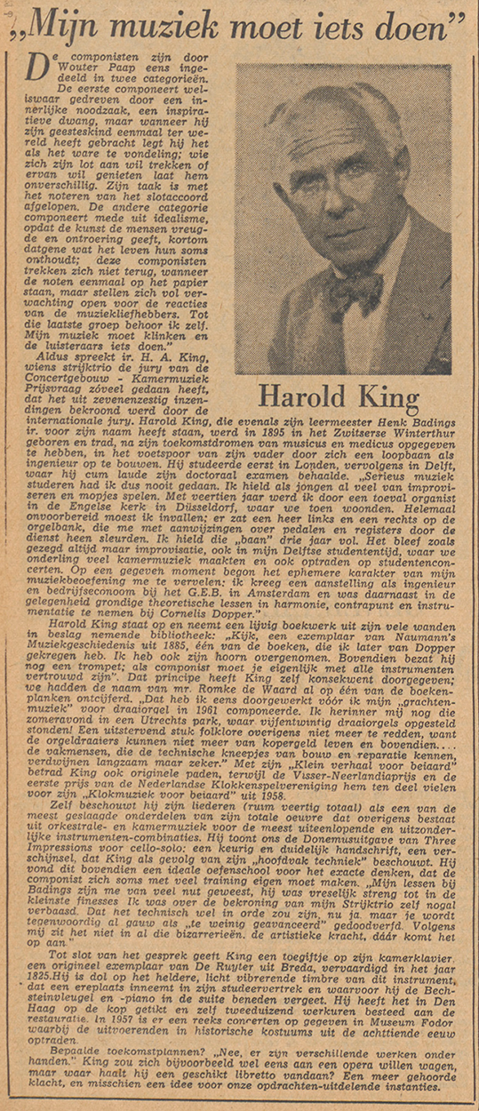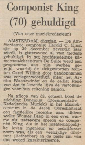 Kamermuziekcentrum De Suite gehuldig. Die bariton Carel Willink moes optree, maar was olik en bandopnames van die sang van King se liedere is v oorgespeel. Rene van Ast het van King se liedere uitgevoer. Na afloop van die konsert het Donemus in die Muziek-centrum in Jacob Obrechtstraat, Amsterdam ‘n feestelike ontvangs aangebied waar Wouter Paap ‘n gepasde toespraak gelewer het. Harold King se oeuvre bestaan uit 84 komposisies, 106 publikasies in 6 tale, verkrygbaar in 167 biblioteke wêreldwyd.