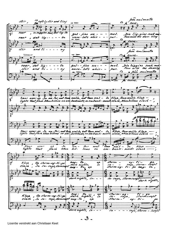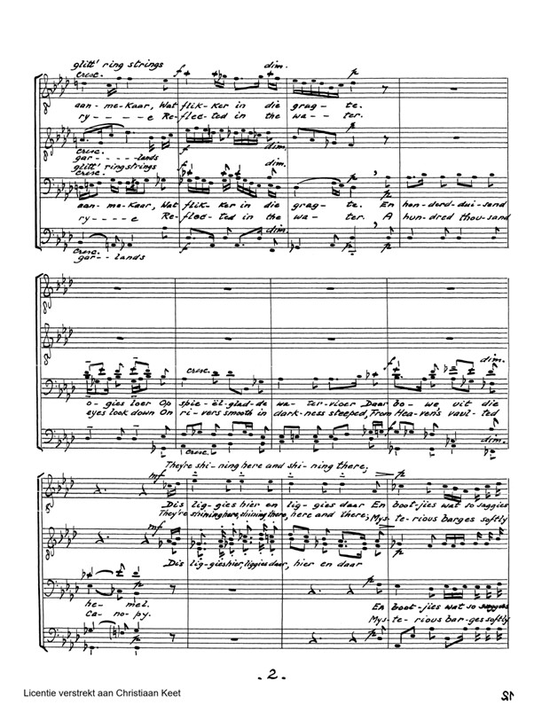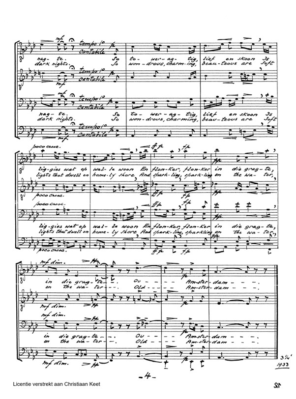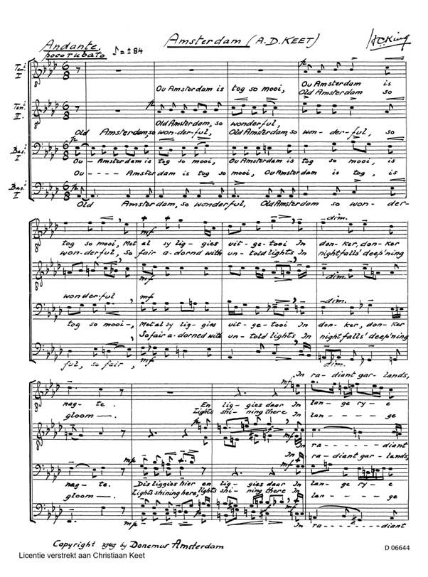 Amsterdam, 1933, Afrikaans en Engels vir mannekoor, uitgegee deur Donemus 1949.