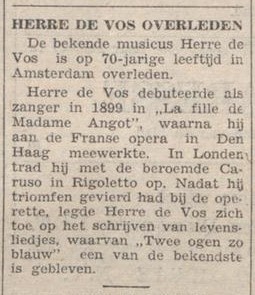 De Vos is op 70 oorlede na ‘n buikoperasie in Binnengasthuis, Amsterdam, en op Saterdag 21 Februarie 1948 te Driehuis, Noord-Holland in die Krematorium te Velsen veras.