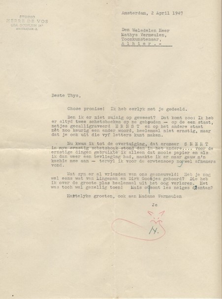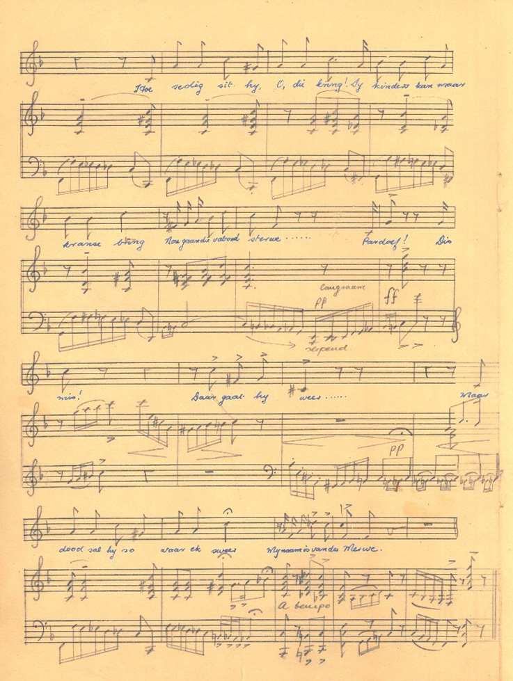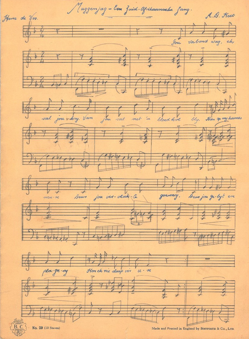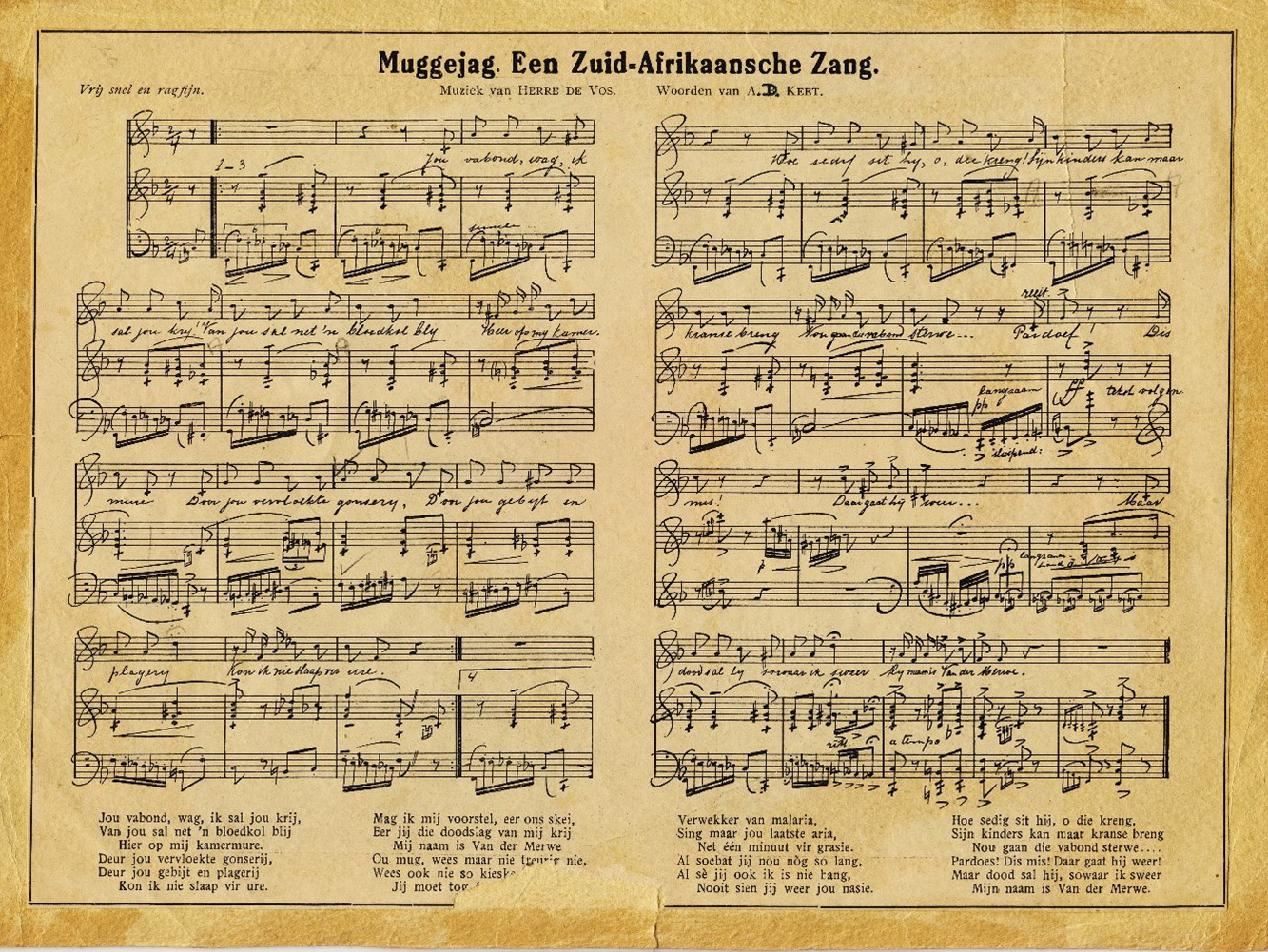 Die gedig van Keet wat De Vos getoonset het, is Muskietejag, vertaal in Nederlands as Muggejag, Een Zuid-Afrikaansche Zang. Hierdie handgeskrewe toonsetting is gevind in die Keet Nalatenskap. Die posdiensstempel op die koevert lees London F.S., Feb 25, 1926, 5:45. Keet se aantekening op die koevert versterk die vermoede dat die posstuk deur De Vos self aan AD Keet versend is.