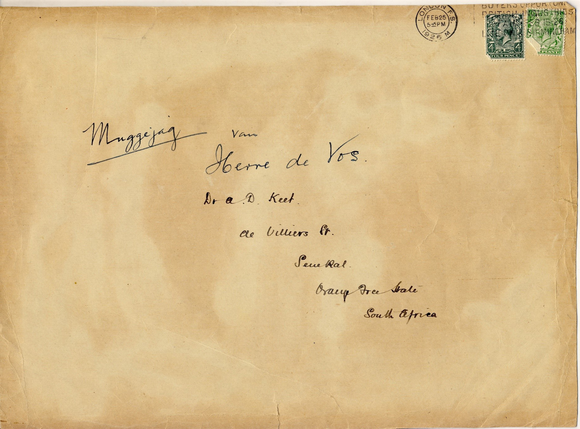 Posstuk uit Keet Nalatenskap met toonsetting van Herre de Vos, posstempel 25 Februarie 1926.