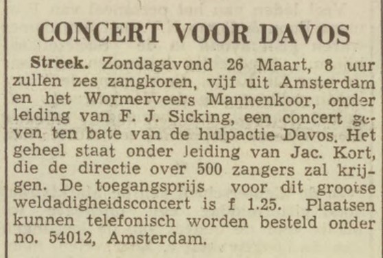 Het Zaans Bachkoor zal, onder leiding van den heer Jac. Kort het door Carl Philipp Emanuel Bach gecomponeerde werk ,,Die Israëlieten in der Wüste” uitvoeren. Als datum voor de uitvoering te Zaandam is 16 November - Carl Ph. Em. Bach. De componist, Carl Phil. Emanuel Bach, werd. 8 Maart 1714 als 2e zoon van Johann Sebastiaan Bach geboren. In 1775 gaf hij zelf zijn oratorium „Die Israëlieten in der Wüste” uit en voerde het werk toen uit. Daarna verdween het, om in het jaar 1814 wederom op te duiken. Het Zaans Bachkoor zag evenwel niet tegen dit werk op, zodat met zekerheid kan worden aangenomen, dat het de eerste uitvoering in Nederland zal zijn. Het gegeven is een Bijbelse voorstelling, naamlijk de omzwerving van de Israëlieten in de woestijn. Zijn (Kort) directie is correct, zonder overbodige gebaren en de Zaans Bachkoor onder zijn leiding de kans heeft, goede dingen te doen.”