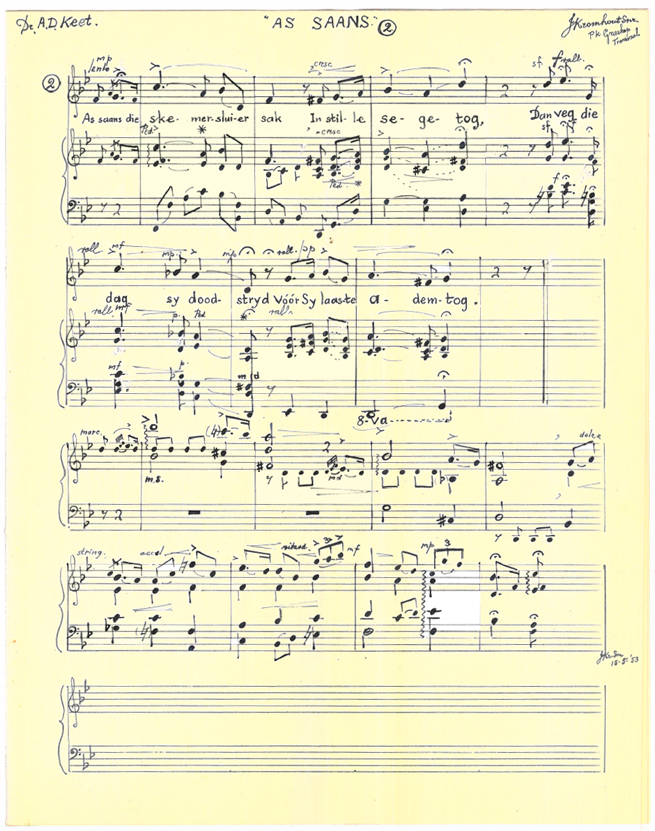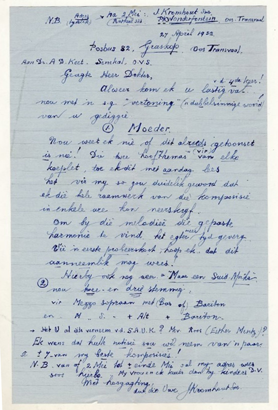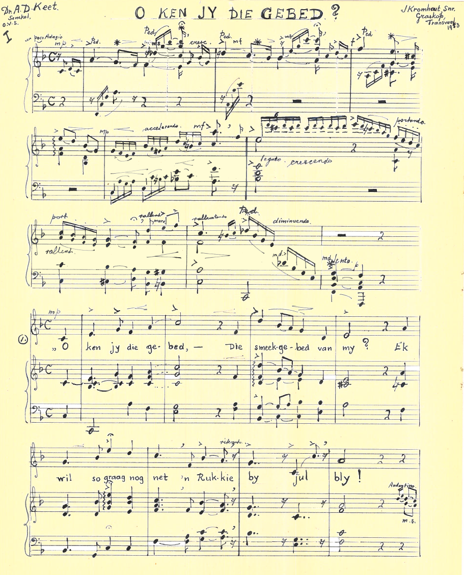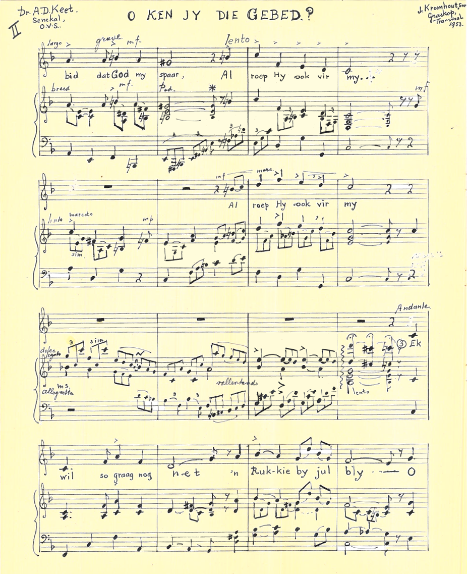 Kromhout en Keet het gereeld gekorrespondeer en Kromhout het die toonsettings wat hier gepubliseer is, aan Keet gepos en in die Keet Nalatenskap gevind. Ook die volgende toonsettings is daar gevind: HAL Hamelberg: Vrystaatse Volkslied, 26 Mei 1948; TJ Haarhoff: Die wens van Plato (1951); JRL van Bruggen: ‘n Simpel liedjie (1951); AG Visser: Geboorte van die Lente (1953), Princess Lointaine (Prinses van Verre) (1951) en ‘n Ruiterlied (Salut d’Amour) (1951); CL Leipoldt: Oktobermaand (1974); S.Ign. Mocke: Voorwaarts (1950) en 1951; W von Goethe: Schweizerlied (1953). Hierdie toonsettings is vir bewaring aan die Departement van Musiek, Universiteit Pretoria oorhandig.