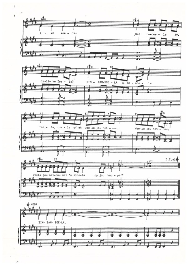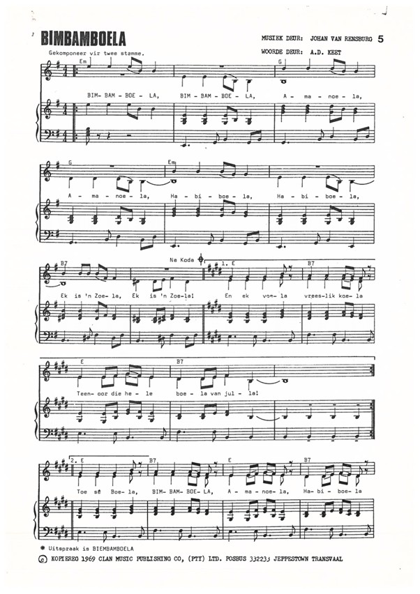 Die Universiteit van Stellenbosch se koor het Bimbamboela, met die toonsetting van Johan van Rensburg, in 1974 en 1975 gesing.