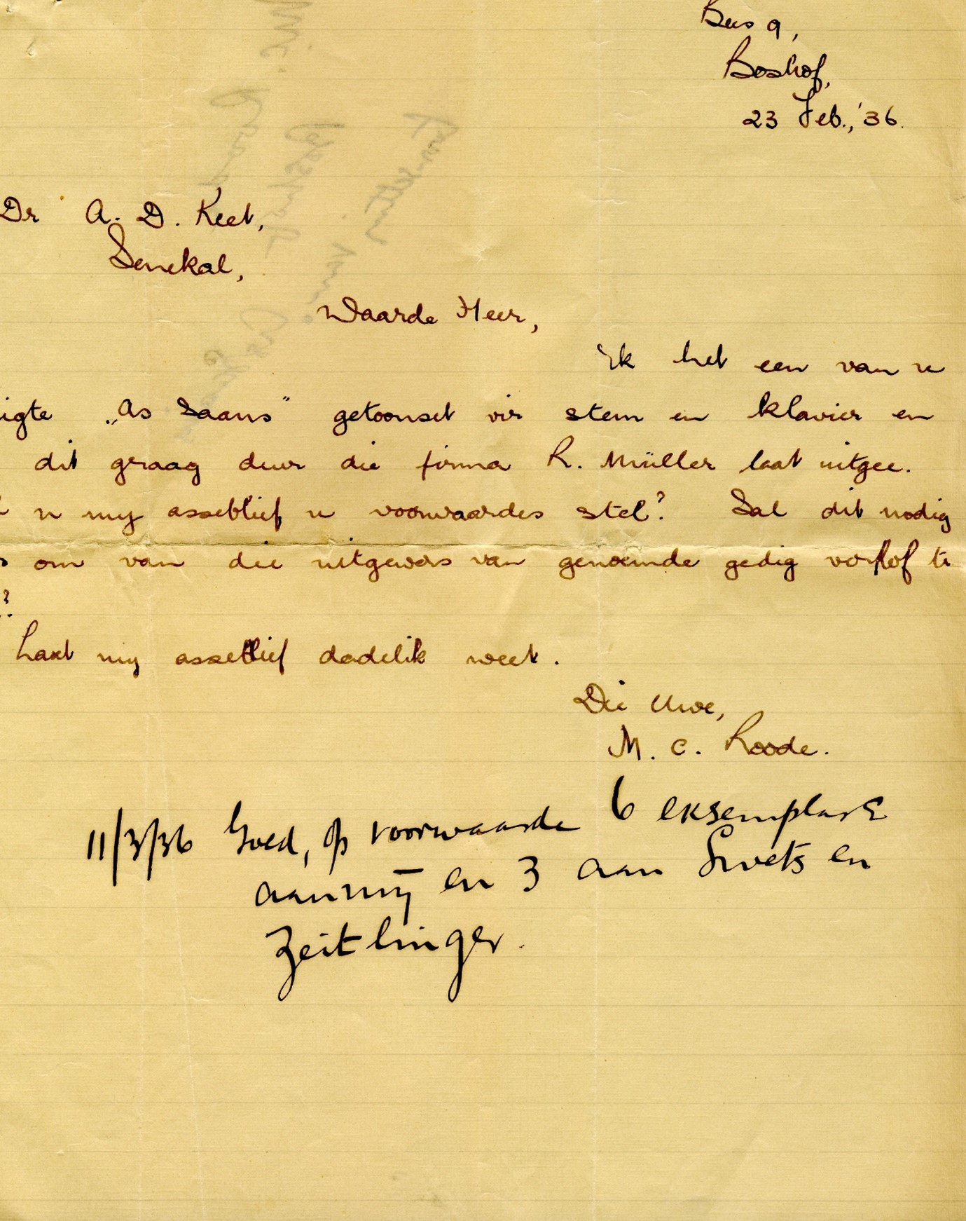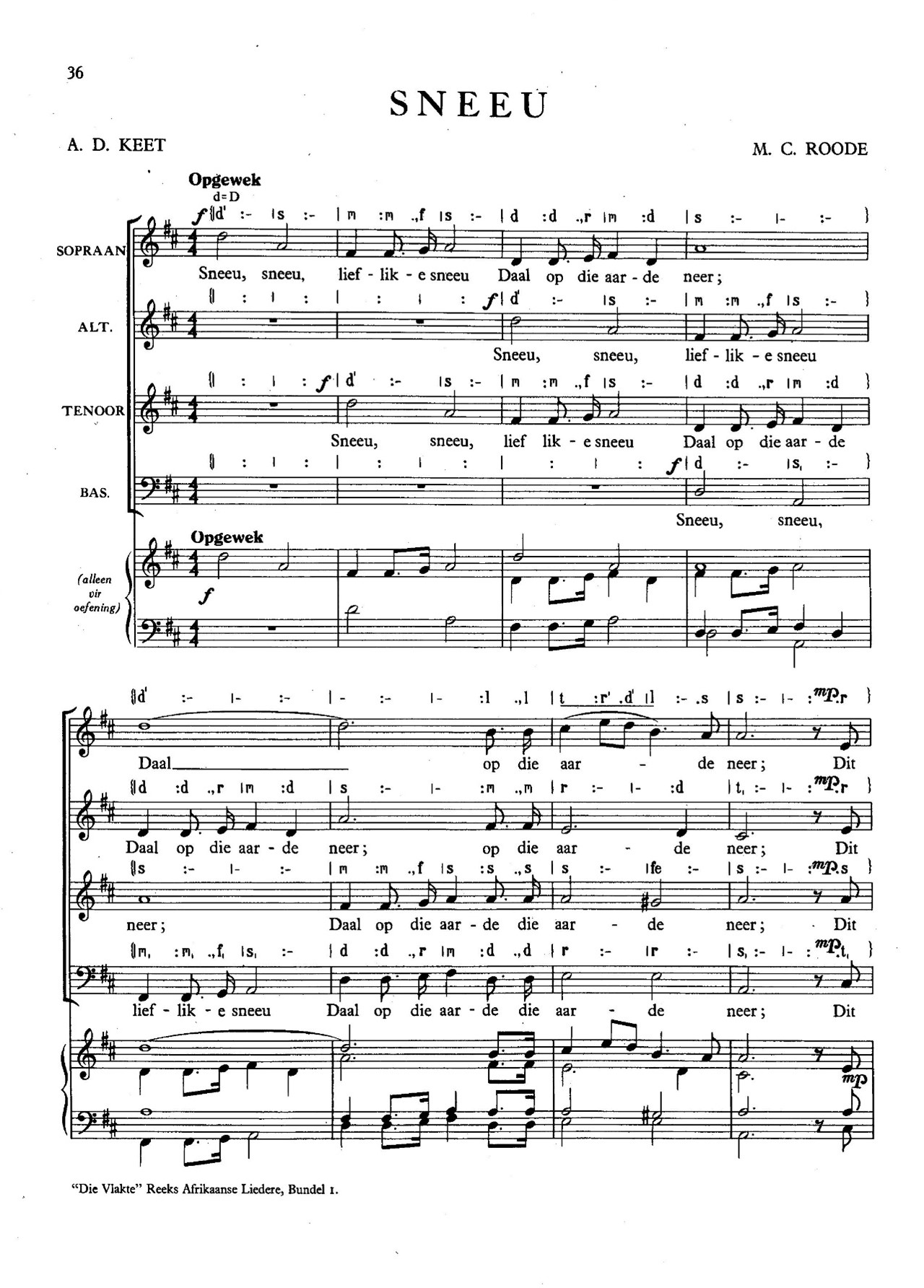 Op Vrydag 28 Maart 1952 het hy met ‘n feeskoor na Kaapstad vertrek. Die koor se optredes was geskeduleer vir 3 en 4 April. Ses werke is uitgevoer; twee was liedere met woorde van Keet, naamlik Sneeu, getoonset deur Maarten en As Saans, getoonset deur H Barton. Dirkie de Villiers het in 1959 by Roode en verskeie ander toonsetters / komponiste toestemming verkry vir die insluiting van Sneeu in die FAK Sangbundel.
