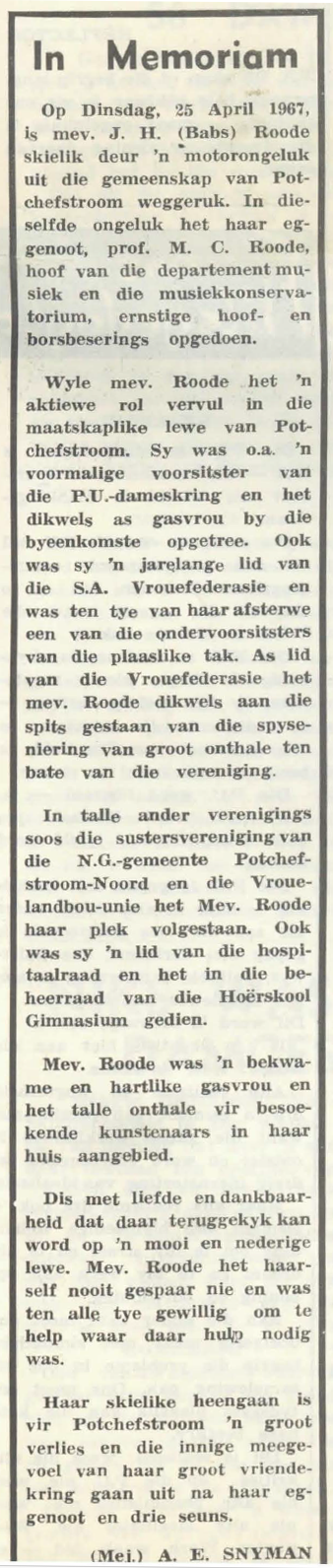 Die kleurryke era in die geskiedenis van die Pukke se konservatorium is onverwags in 1967 op ‘n tragiese wyse afgesluit toe Maarten en Babs in ‘n motorongeluk in Potchefstroom oorlede is. In Potchefstroom is ‘n straat na Maarten Roode vernoem.