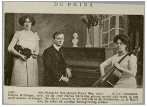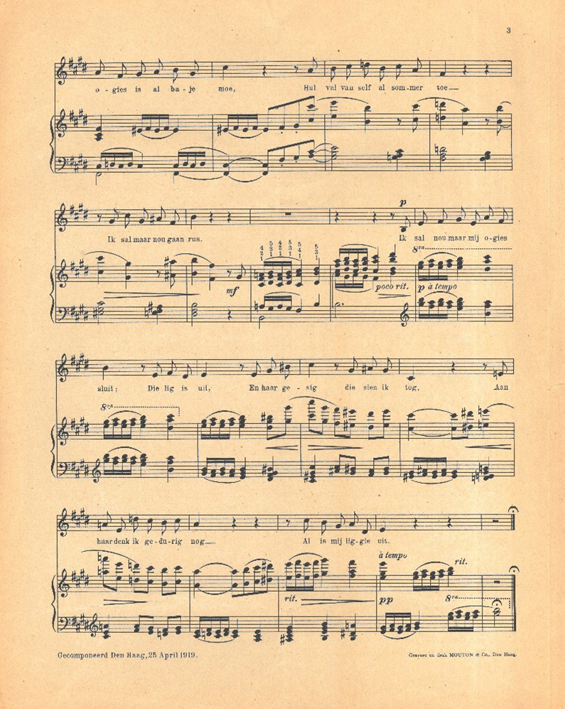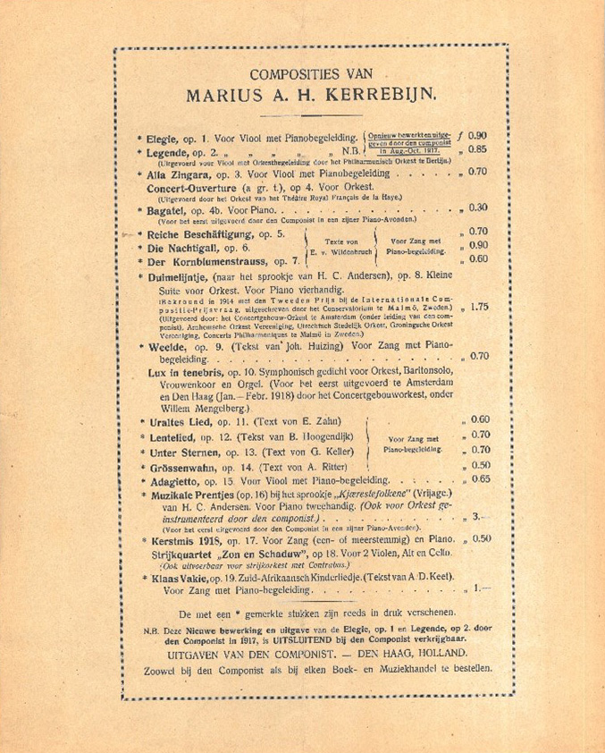 Die sterwensberig in Die Nieuwsblad van het Noorden, Woensdag 18 Junie 1930: Te ‘s Gravenhage is plotseling overleden op 47-jarigen leeftijd, de bekende musicus Marius Kerrebijn. In een muzikale familie opgegroeid, bezocht Kerrebijn, die een geboren Hagenaar was, het Kon. Conservatorium voor muziek, waar hij een diploma voor solo-pianospel en den Nicolaï-prijs voor compositie behaalde. Hij voltooide zijn studie in het buitenland, n.l. te Berlijn en te Parijs. Hij heeft met verschillende composities naam gemaakt en is in ons land en in Duitschland, Frankrijk, Engeland en Zweden met success als pianist opgetreden, ook met eigen werk. Ook als dirigent, o.a. met het Concertgebouw-orkest te Amsterdam, heeft Kerrebijn lauweren ge-oogst. Kerrebijn’s Orkestsuite op. 8 is te Malmö (Zweden) bekroond. Hij was sinds eenige Jaren o.m. hoofd-leeraar voor piano aan de Rotterdamsche Muziekschool van Toonkunst.