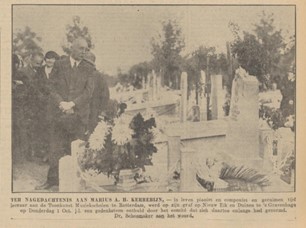 ’n Gedenksteen is op sy graf in Nieuw Eykenduyen opgerig: Gisteren is op Nieuw Eik en Duinen een gedenksteen onthuld op het graf van den verleden jaar overleden Marius Kerrebijn, in leven pianist, componist en oud-leeraar aan de muziekschool van „Toonkunst" te Rotterdam. De voorzitter van het comité, de heer A. J. J. L. Moolenburgh, bracht namens de familie dank aan alle aanwezigen voor hun komst en aan allen, die financieel het plan steunden voor deze onthulling, welke men heeft willen verrichten op den verjaardag van Marius Kerrebijn. Nadat spr. het monument aan de familie had overgedragen, schetste dr. J. Schoemaker Marius Kerrebijn als kunstenaar en als mensch. De gedenksteen is uitgevoerd in witte Jura-steen en bekroond met een lier, waaronder de woorden: „Zijne vereerders". Voorts werd er eenige bloemstukken op het graf gelegd.
