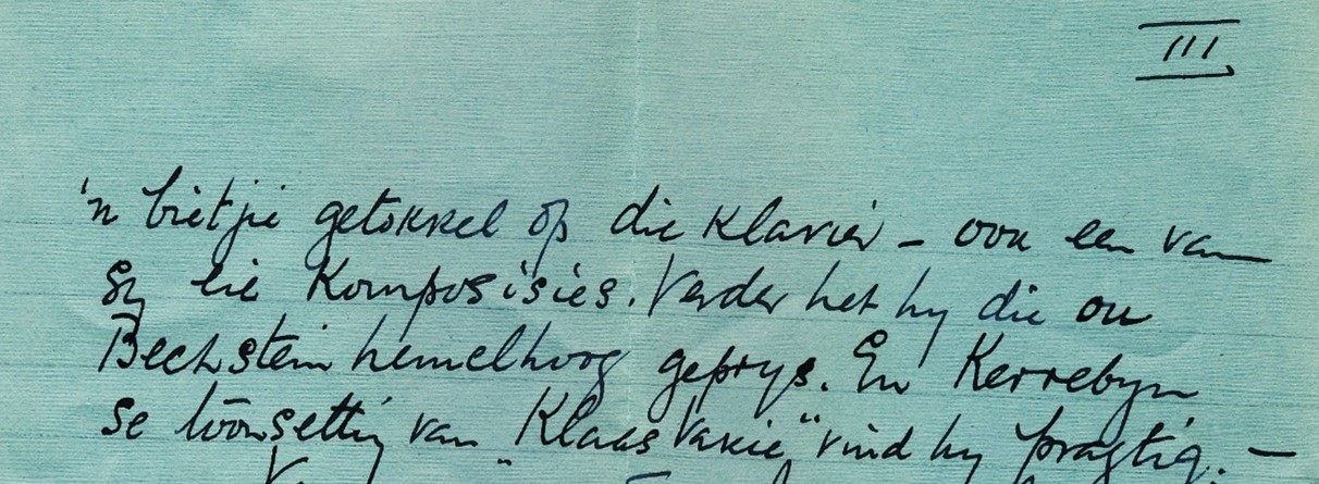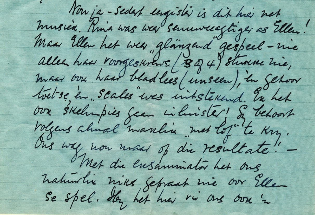 Uittreksel uit brief van AD Keet Snr aan AD Keet Jnr, 7 September 1956. Rina is Keet snr se vrou en Ellen is Keet snr se een dogter, wat op die Eisteddfod gespeel het, en later by Kaapse Universiteit haar musiekopleiding ontvang het: