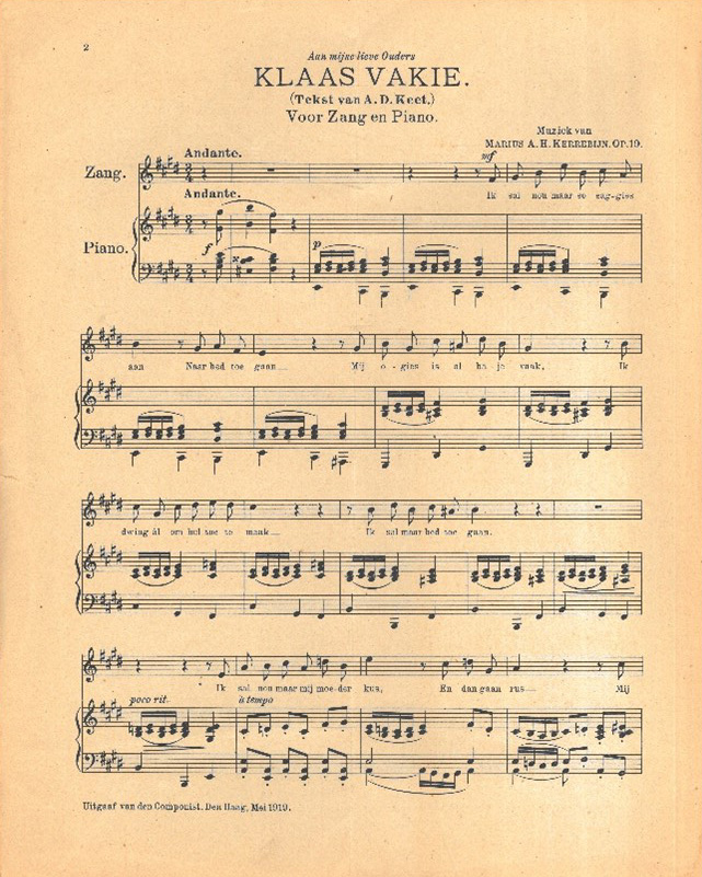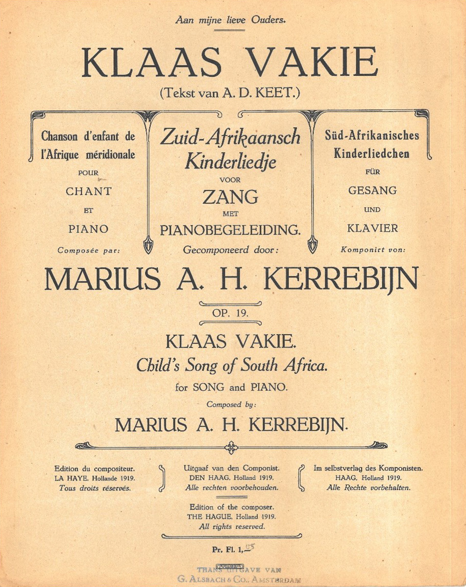 Die gedig van Keet wat Kerrebijn getoonset het, is Klaas Vakie (1919). Hierdie handgeskrewe toonsetting is gevind in die AD Keet Nalatenskap, tesame met die oorspronklike gefrankeerde koevert waarin die toonsetting aan Keet gepos is. Kerrebijn het die toonsetting aan sy ouers opgedra.