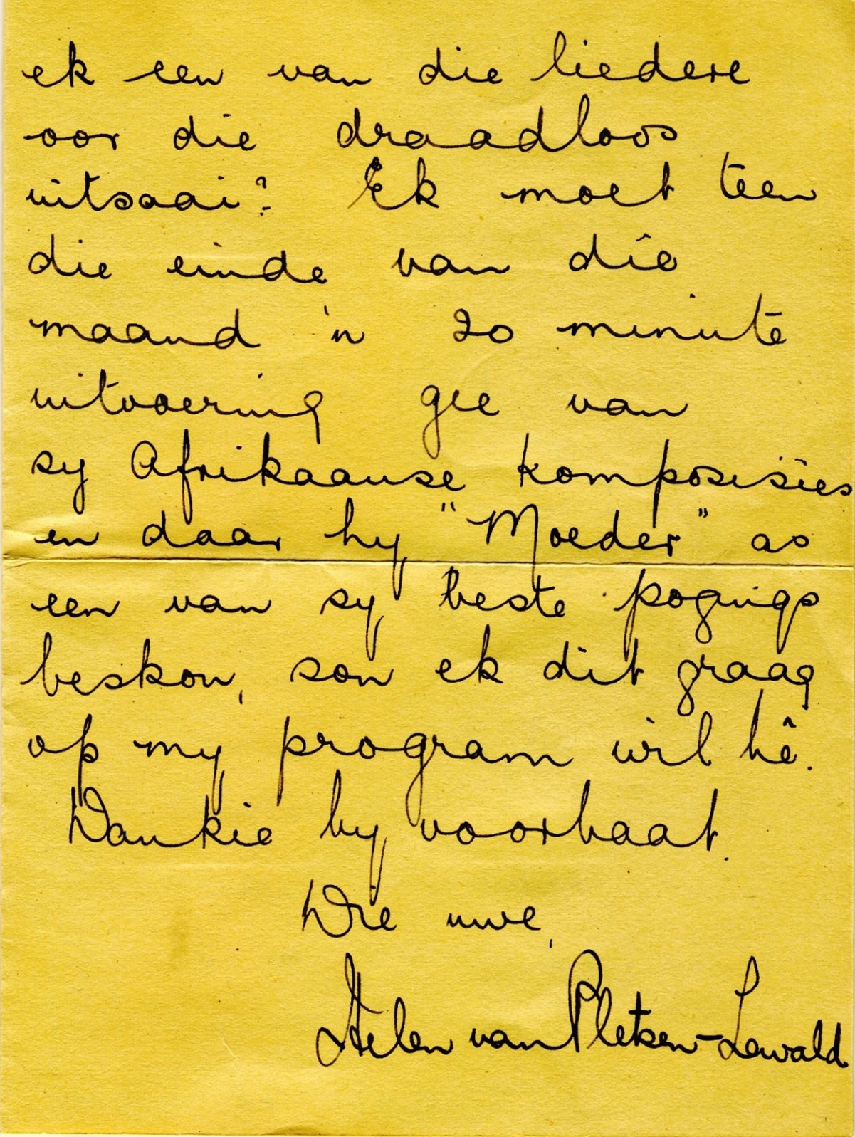 Binne die bestek van die twaalf jaar tussen 1938 en 1950 het Lewald sowat twee en twintig liedere met Afrikaanse woorde getoonset, waarvan sommige deur Helen op radio-uitsendings en konserte gesing is.